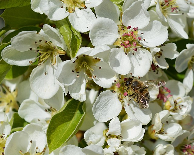 Tout comme le pommier, le poirier peut être qualifié d'autoincompatible à divers degrés suivant les variétés. Ainsi, dans un verger, il est essentiel de cultiver au moins deux variétés différentes capables de se polliniser mutuellement. Le vent n'intervient que de manière négligeable dans la pollinisation du poirier. Les poiriers fleurissent au début du printemps, en mars-avril, lorsque les températures sont encore relativement fraîches pour les abeilles domestiques. Ces dernières visitent les fleurs principalement lorsque les températures dépassent 11°C, limitant ainsi leur activité pendant les périodes plus fraîches. En conséquence, les principaux agents pollinisateurs pour les poiriers sont souvent les abeilles sauvages et les syrphes, qui sont moins affectés par les températures plus fraîches (en fonction des espèces), et continuent d'assurer une pollinisation efficace même lorsque les conditions ne sont pas optimales pour les abeilles domestiques.