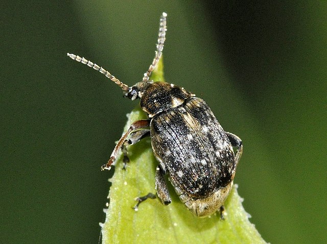 Adulte: - longueur moyenne: 3,5-5mm - présence une longue pointe à l’angle interne des tibias postérieurs - protorax est plus au moins denté latéralement - tête petite et noire, prolongée en museau court - corselet est couvert d’un épais duvet d’un gris jaunâtre - élytres sont plus larges que le corselet, noirs striés avec des taches grises. 1 Larves: - mesurent 5 à 6 mm de long - tête brune - corps blanc légèrement jaunâtre et incurvé. Leur plaque pro-thoracique présente une série de dix dents . Elles sont sub-cylindriques en forme de C. 2,3