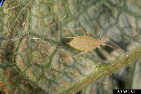 Les pucerons colonisent la face inférieure des feuilles. Ils insèrent leurs pièces buccales de type piqueur-suceur dans les feuilles et prélèvent la sève. Ils engendrent des malformations sur les feuilles qui noircissent et dessèchent. Lors de fortes pullulations, la croissance des pousses peut être ralentie ou arrêtée nuisant ainsi à la formation des fruits. Les principaux dégâts causés sont dû au fait qu'il représente un vecteur important de maladies.