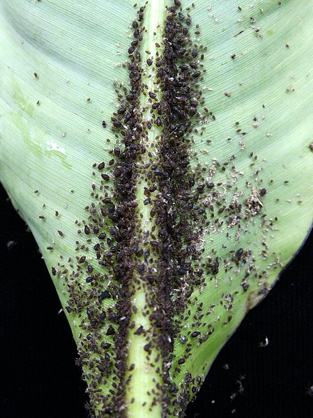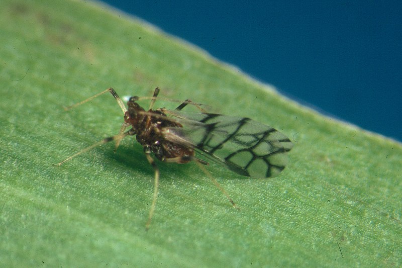 Il n'y a pas de mâles chez cette espèce, on parle donc d'une reproduction par parthénogenèse. Les femelles donnent naissance à 2 clones par jour. Cette reproduction est de type vivipare, c'est à dire qu'il n'y a pas de stade oeuf, les jeunes sortent directement vivants de l'abdomen des femelles. La durée de vie est de 3 à 4 semaines avec 4 stades larvaires (mue en 1 à 2 semaines) et seulement 2 semaines de stade adulte. Chaque adulte produit à peu près 10 à 15 petits. Au bout de 7 à 10 générations, des individus ailés apparaissent du fait d'une baisse de disponiblité alimentaire.1