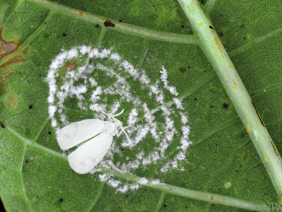 La durée du cycle biologique (de la ponte à la sortie de l'adulte) varie selon la température mais dure entre 3 et 4 semaines. L'adulte mobile va pondre et fixer son oeuf sur les feuilles de la plante hôte. Ces pontes sont disposées en spirales caractéristiques. Après 7 à 10 jours, cet oeuf va donner une larve qui va se développer sur 4 stades larvaires pendant 20 à 35 jours. La larve 1 est peu mobile, elle se déplace sur de courtes distances et peut même être dispercée par le vent, puis elle se fixe sur un site de nutrition. A partir du moment où elle est fixée sous une feuille, les 3 autres stades se développent en se nourrisant de la sève de la plante hôte. A partir du stade 4, la pupaison débute avec l'arrêt de prélèvement de sève. Cette pupe va ensuite se transformer en adulte (ou imago) qui va vivre pendant 2 semaines.1,2