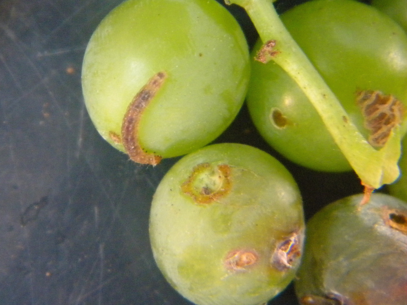 Les chenilles des générations 2 et 3 pénètrent dans les baies, entraînant une perforation de celles-ci en cours de maturation. Il peut y avoir une perte de récolte lorsque les populations sont importantes.