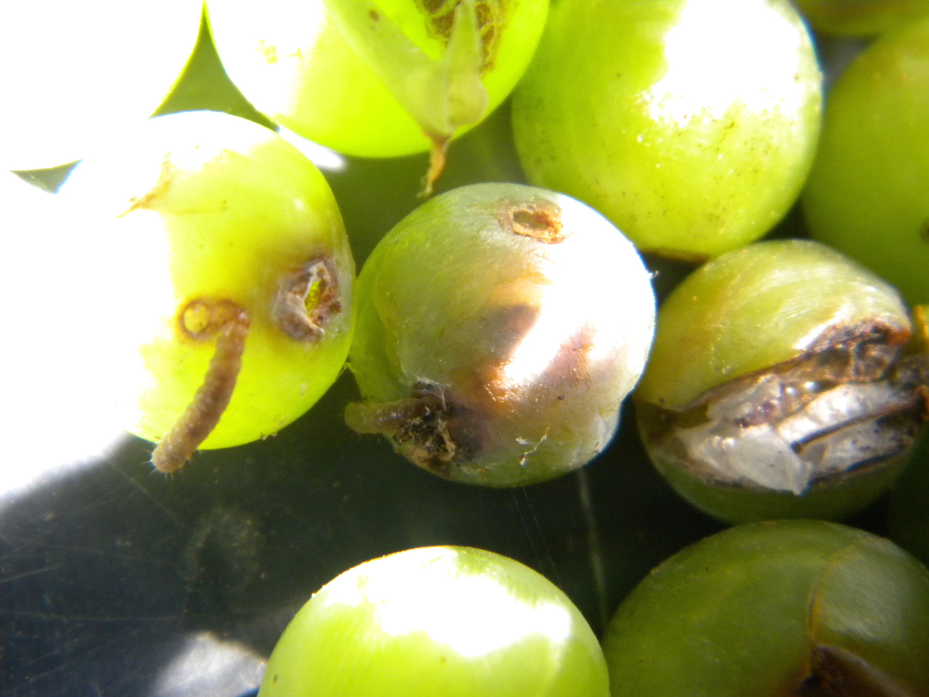 La pourriture grise, induite par Botrytis cinerea, peut être favorisée, du fait de la présence des trous d'entrée dans les baies, d'autant plus en conditions humides.