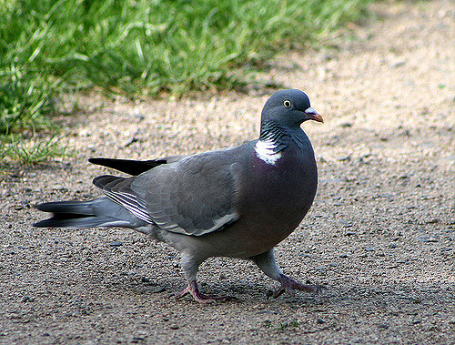 Les adultes présentent un plumage bleu-gris, qui devient rosâtre sur la poitrine. Une tache blanche est bien visible de chaque côté du cou qui présente aussi des reflets verts métalliques. En vol, on peut observer une large bande blanche sur ses ailes et une bande terminale noire sur sa queue. Le bec est rougeâtre et son extrémité est jaune. Les pattes sont roses. Les jeunes sont plus ternes et la tache blanche sur le cou n’est pas encore visible (elle apparait autour de 6-8 semaines). 1 Longueur : jusqu’à 42 cm - Envergure : jusqu’à 76 cm - Poids : en moyenne 500 g Confusion possible avec le pigeon biset (Columba livia) : celui-ci est plus petit, les bandes sur les ailes sont noires et il ne présente pas de tache blanche sur les côtés du cou. 2 Cycle Biologique