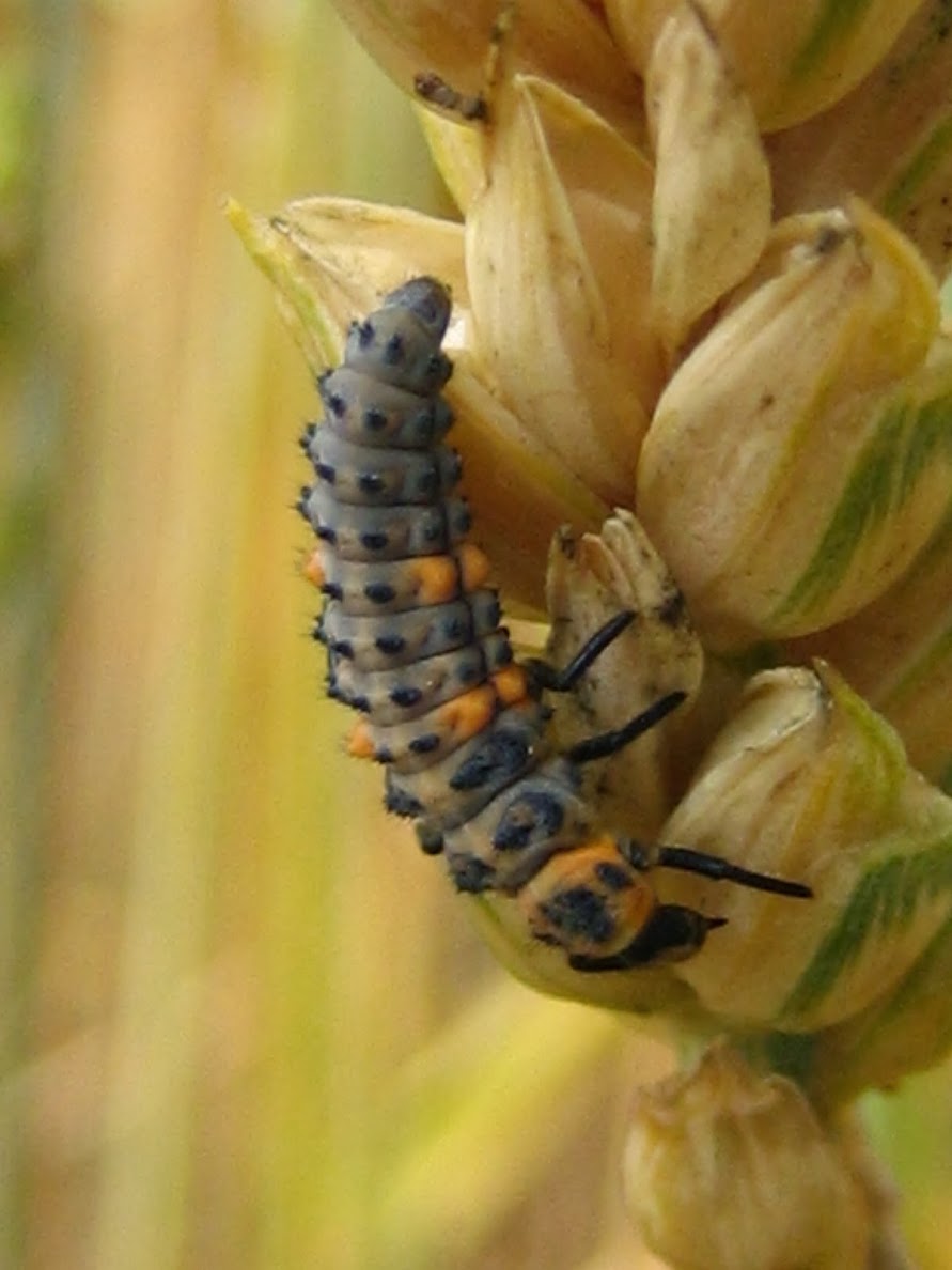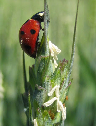 PRINTEMPS : Au début du printemps, les coccinelles sont présentes dans les jachères florales et les haies en abondance équivalente. Ensuite, après une hivernation, la coccinelle à 7 points s'active en fin d'hiver et pond en avril/mai une grande quantité d’œufs jaunes (500 à 1000) répartis dans des colonies de pucerons. Les larves, fuselées, de couleur bleu gris, métallique, ont un appétit extraordinaire, et peuvent dévorer jusqu'à neuf mille pucerons durant les trois semaines de leur développement.