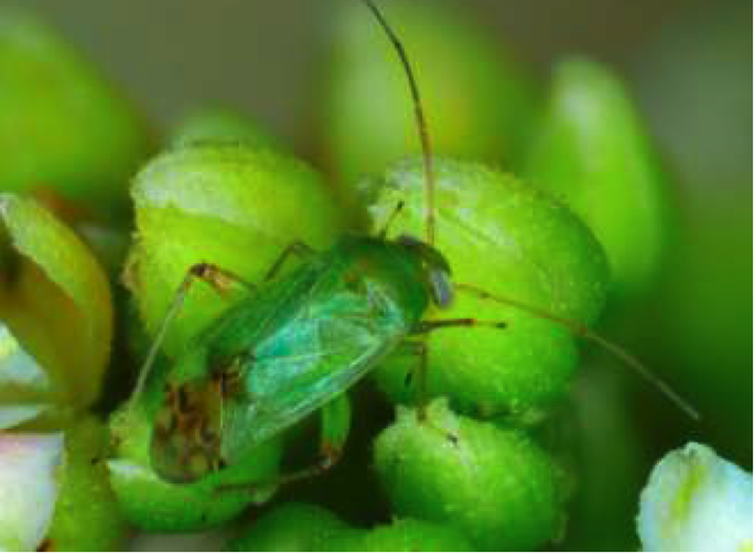 La punaise Orthops palus est une Miridae de petite taille (environ 3,5 mm) de couleur jaune ou vert pâle.1 A la Réunion, Orthops palus Taylor est considérée comme le principal bioagresseur en vergers de manguiers (Mangifera indica L.). Les dégâts sont provoqués par les larves et les adultes polyphages, qui piquent les bourgeons, les jeunes pousses et les inflorescences afin d’en extraire la sève pour se nourrir. Son statut de ravageur n’est reconnu qu’à la Réunion d’où le peu de connaissances et de publications disponibles. 2 Orthops palus est très polyphage et a été retrouvée sur 46 espèces végétales. Outre le manguier, le Poivre rose (Schinus terebinthifolius), le Lychee(Lithci chinensis) et le Jujube (Ziziphus mauritania) sont considérés comme des plantes hôtes.3 Cycle Biologique