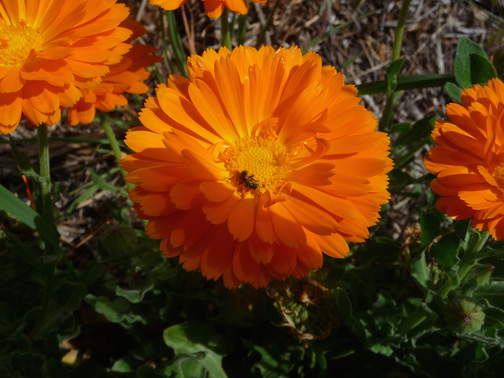 C. Gibert, Solagro. Abeille sauvage butinant sur un capitule de souci officinal (Calendula officinalis) à proximité d'une serre maraîchère dans le Lauragais (31).