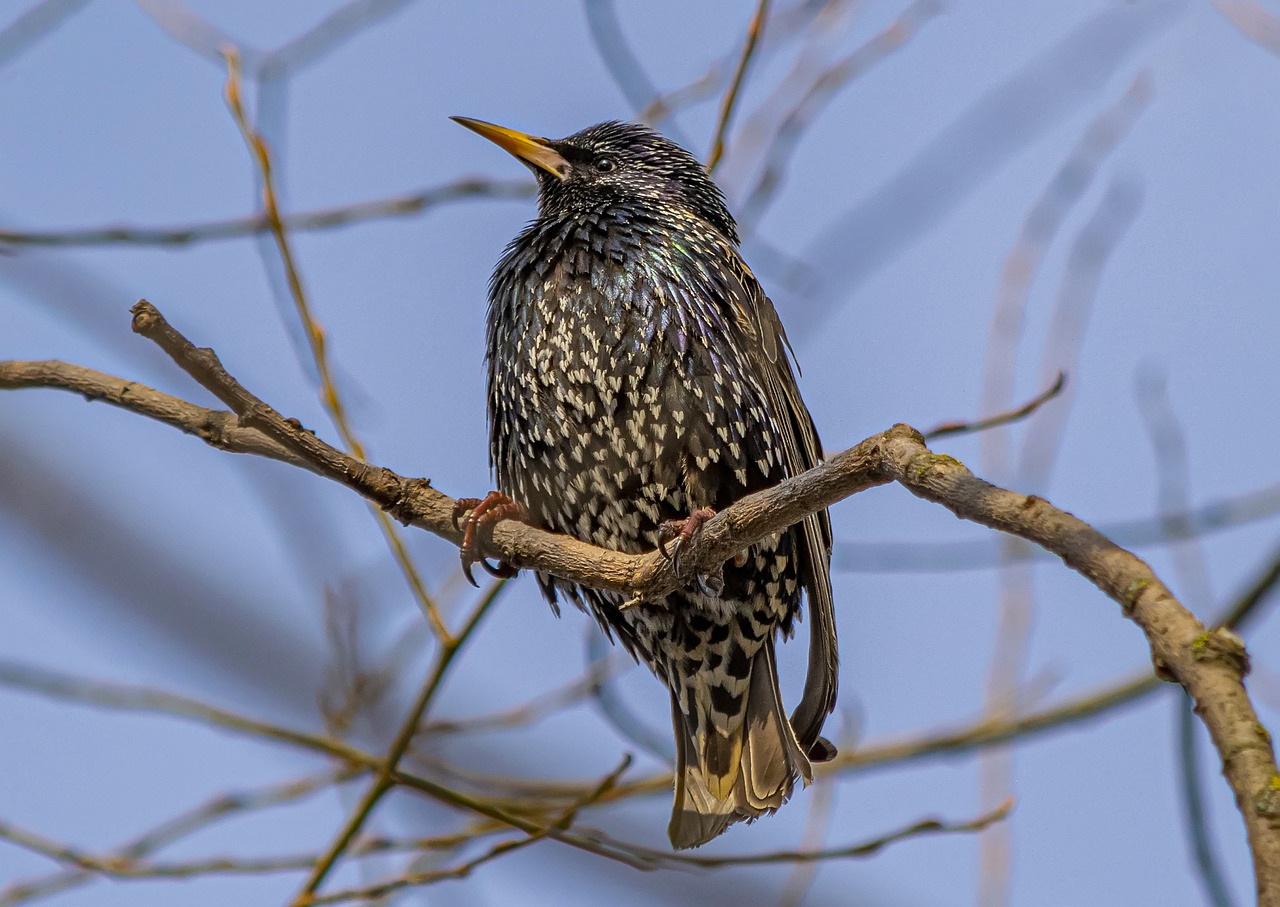 L'oiseau adulte mesure 18cm et a une envergure de 37cm. Son plumage est noirâtre, moucheté, avec des reflets violets et verts. On observe des triangles blancs-roux sur la tête et le cou. Ses ailes son pointues, sa queue est courte, son bec est effilé et conique. La femelle est plus tachetée que le mâle. Les jeunes oiseaux sont gris avec la gorge blanche. Les œufs sont bleus pâles. 1 Cycle Biologique