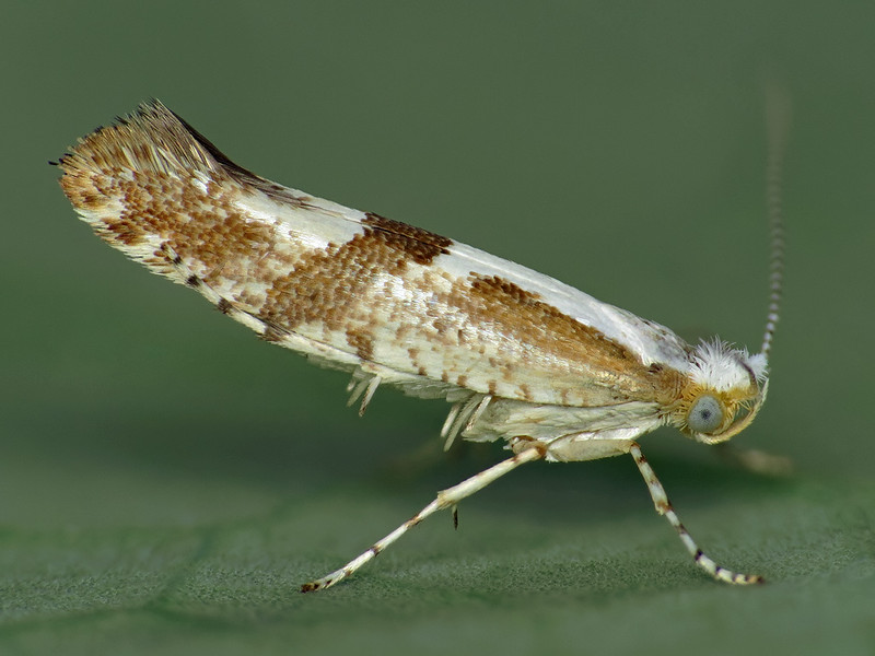 L'adulte a une envergure de 10-12mm. Il est brun avec des taches dorsales blanches. Les œufs sont plats, en forme de poire, de brun à gris, en passant par la couleur vert olive. Ils mesure 0,3 - 0,5mm. Les larves mesurent 10 mm de long et sont de couleur jaune-verte. Les pupes sont marron avec des teintes de vert, et mesurent 5mm de long. 1