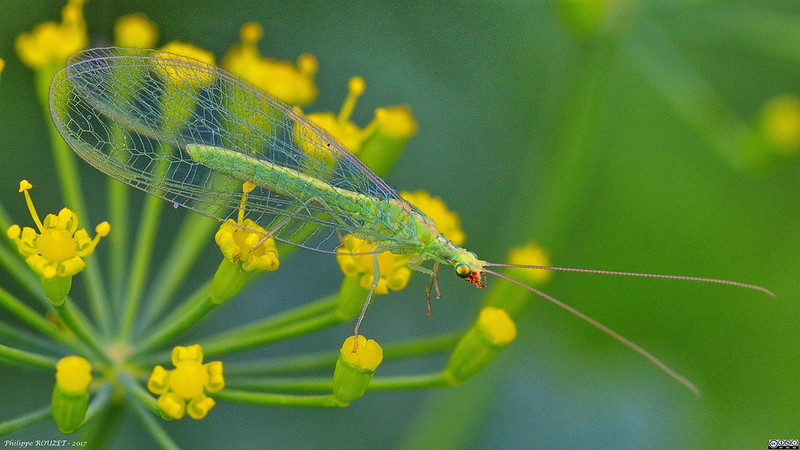 Chrysoperla est un genre de chrysope. Ce sont des insectes Neuroptères, de petite taille (moins de 20 mm), caractérisés par des ailes nervurées et un corps de couleur vert-jaunâtre, et de yeux saillants et dorés. Au repos, les ailes sont disposées en toit sur l'abdomen. Les Chrysoperla sont des chrysopes communes, entièrement vertes contrairement à certaines espèces de Chrysopa qui peuvent être marquées de noir à l'avant du corps. Les larves sont d'actives prédatrices, pouvant consommer jusqu'à 500 pucerons par jour, tandis que les adultes sont uniquement floricoles et se nourrissent de pollen ou de miellat. Etant très généralistes et très mobiles, les larves manquent rarement de proies. A l'aide leurs pièces buccales en forme de pinces, elles perforent leurs proies, et injectent leur salive qui va pré-digérer le contenu de la proie, puis qu'elles vont sucer.1 L'espèce Chrysoperla carnea est utilisée en lutte biologique, essentiellement contre les pucerons.