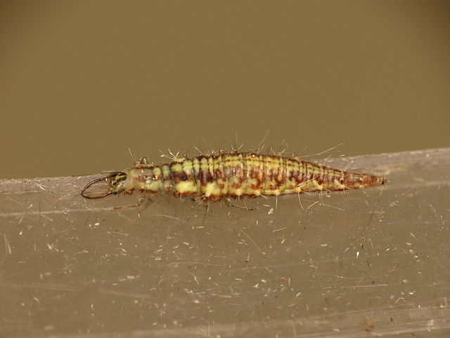 La larve consomme sa proie en injectant sa salive par des pièces buccales de type broyeur, ménagé d'un canal salivaire. Puis elle suce le contenu pré-digéré.
