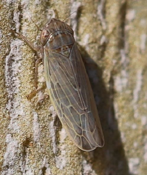 Petit hémiptère de 3,5 à 4,5 mm de long, de couleur vert-brun avec des taches foncées réparties sur le corps et des yeux rouges. Il se déplace par sauts et vols. Ses ailes sont disposées en forme de toit. Critères de reconnaissance de l’espèce : 6 bandes beige longitudinales sur le sommet de la tête, à l’arrière des yeux brun rougeâtre.1