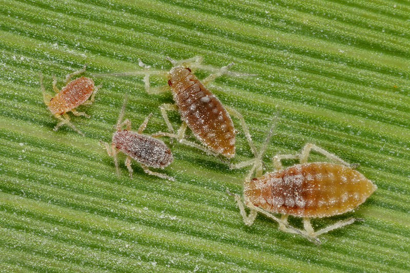 En ce qui concerne Hyalopterus pruni, une forte proportion des pucerons sont aptères et restent sur les plantes hôtes primaires. Les œufs d’hiver sont déposés en très petit nombre sur les troncs et branches des hôtes primaires et éclosent dans le courant du mois d’avril. 2 à 3 générations se succèdent et pullulent sur la face intérieure des feuilles qui s’enroulent très faiblement et prennent une teinte vert pâle. A partir de la 3ème génération (fin mai), des individus ailés apparaissent et émigrent sur les plantes hôtes secondaires. Ils donnent naissance à des aptères qui se tiennent à la face supérieure des feuilles. A partir de fin août, les sexupares ailés mâles retournent sur les plantes hôtes primaires. 2