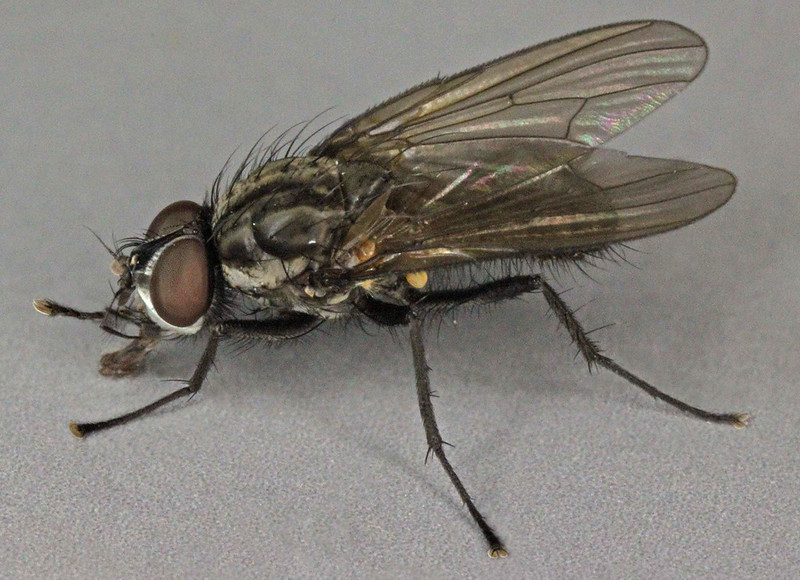 L'imago est une mouche de 6 à 8 mm de couleur grise avec des tâches noires. L'adulte ressemble à la mouche domestique. Les œufs mesure environ 1 mm de long. La larve mesure 1 mm à l’éclosion et 2 mm à l’issue du premier stade. Elle mesurera 4 mm à l'issue du deuxième stade et enfin 8 mm de long et 1 à 2 mm de diamètre au troisième stade. Cet asticot blanchâtre a l'extrémité postérieure ornée d'une couronne de 10 petites pointes noires membraneuses. 12 Cycle Biologique