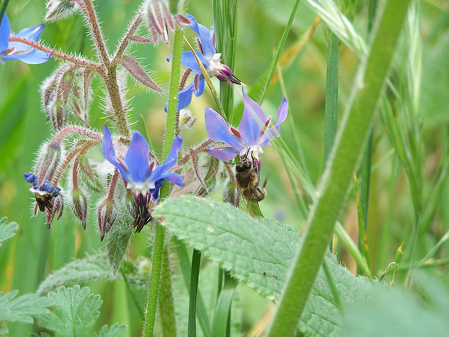 La bourrache se reconnaît à ses poils hirsutes et ses fleurs bleues en forme d'étoile, qui deviennent parfois roses.