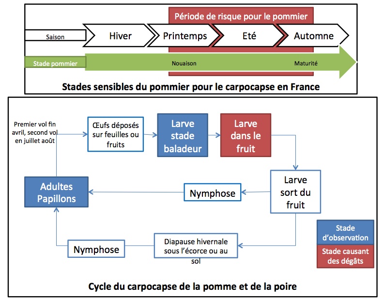 L'adulte émerge en avril et pond sur les feuilles de pommier. Après deux semaines les œufs éclosent. Après l'éclosion, la larve est au stade "baladeur", elle recherche alors un fruit. C'est à stade qu'il faut surveiller la larve car elle est encore à l'extérieur du fruit et donc visible. Les larves pénètrent dans la pomme et creusent des galeries pour se nourrir. Elles se développent jusqu'à leur 5ème stade et sortent alors du fruit. La larve se déplace jusqu'au tronc ou au sol pour trouver un abri et se nymphoser. 4