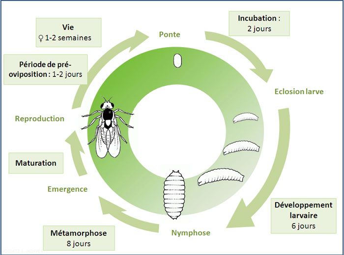 On retrouve de 3 à 4 générations dans l'année. Le cycle complet se réalise en 3 semaines environ.