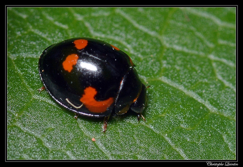 Coccinelle noire de forme ronde, caractérisée par ses quatre taches rouges dont les deux antérieures ont une forme de virgule.1