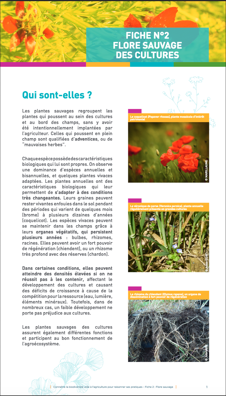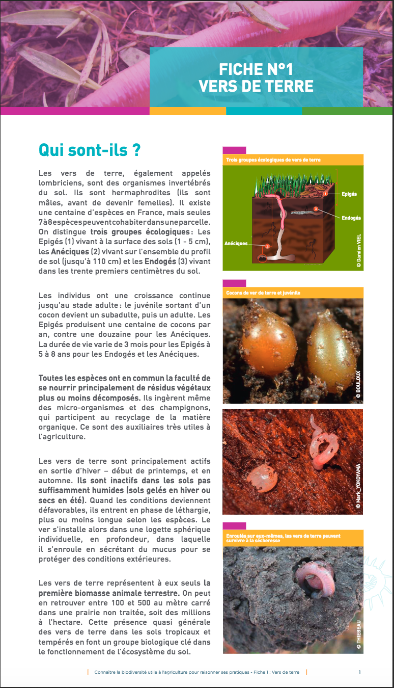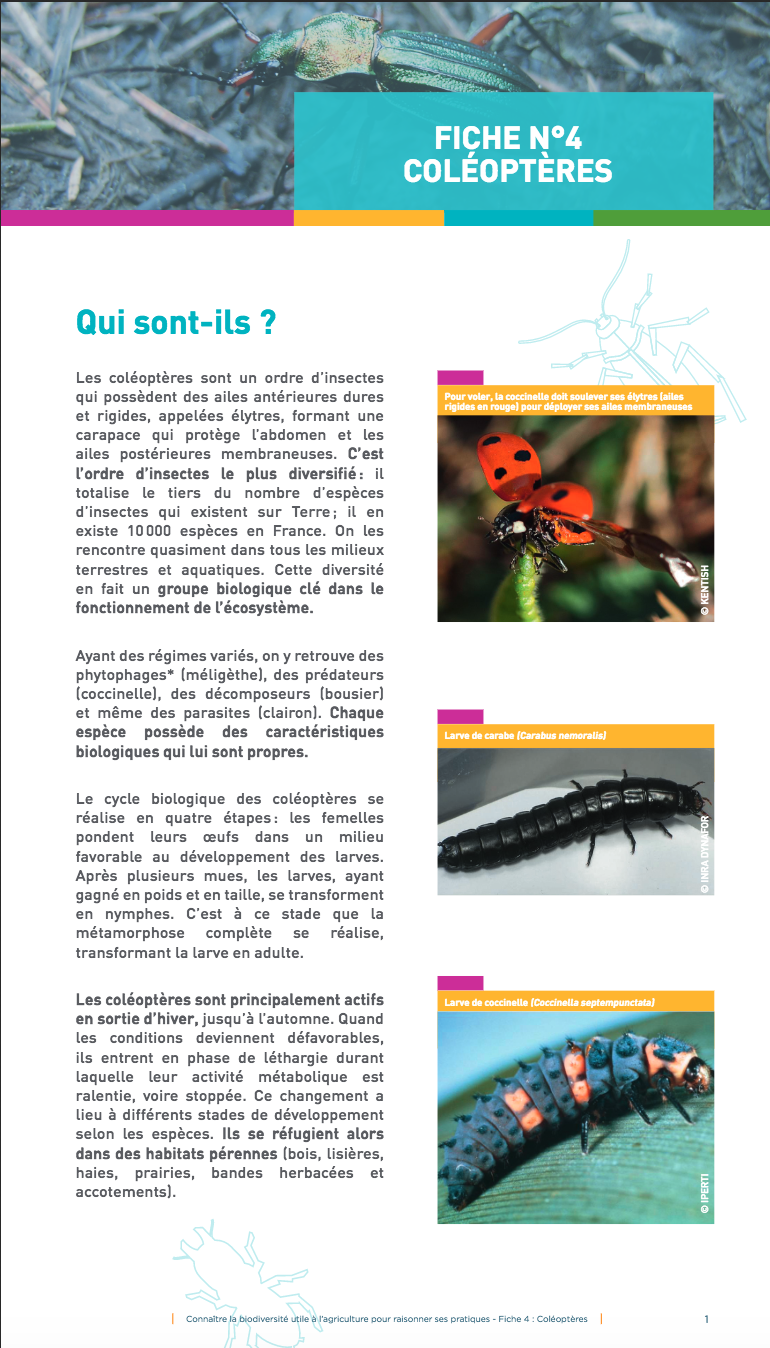 Issues d’un partenariat entre des équipes de recherche et des acteurs de terrain*, ces fiches présentent les principaux services apportés par la biodiversité à l’agriculture. Elles regroupent des données scientifiques récentes et contextualisées. Colorées et très illustrées, elles permettent en une rapide lecture d’en savoir plus sur les vers de terre, araignées, coléoptères, syrphes et flore des champs ! Pour aller plus loin et passer à l’action, des informations pratiques pour favoriser cette biodiversité utile donnent au lecteur des pistes de réflexion, à approfondir selon le contexte pédo-climatique et les choix techniques de l’exploitation agricole.