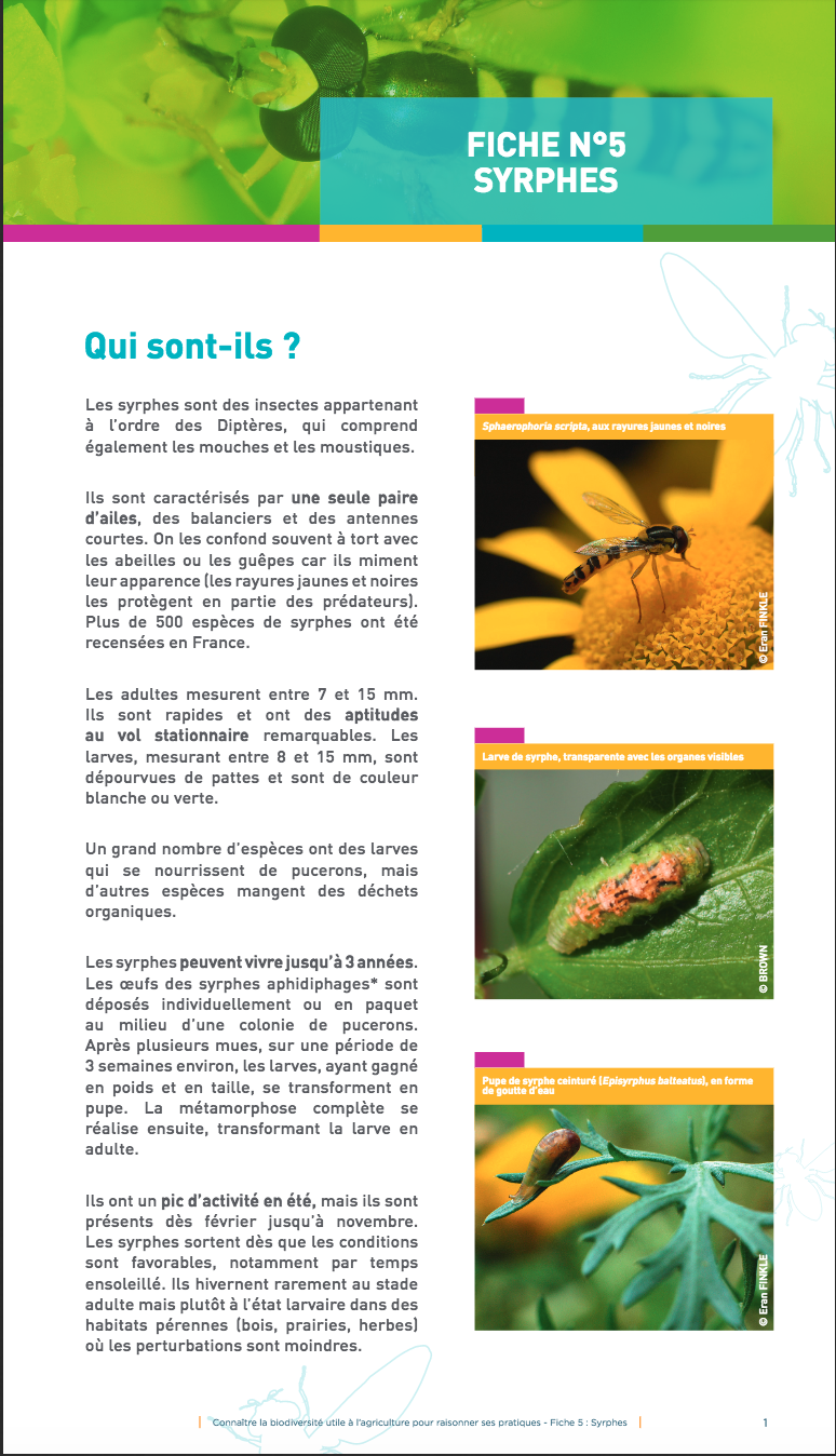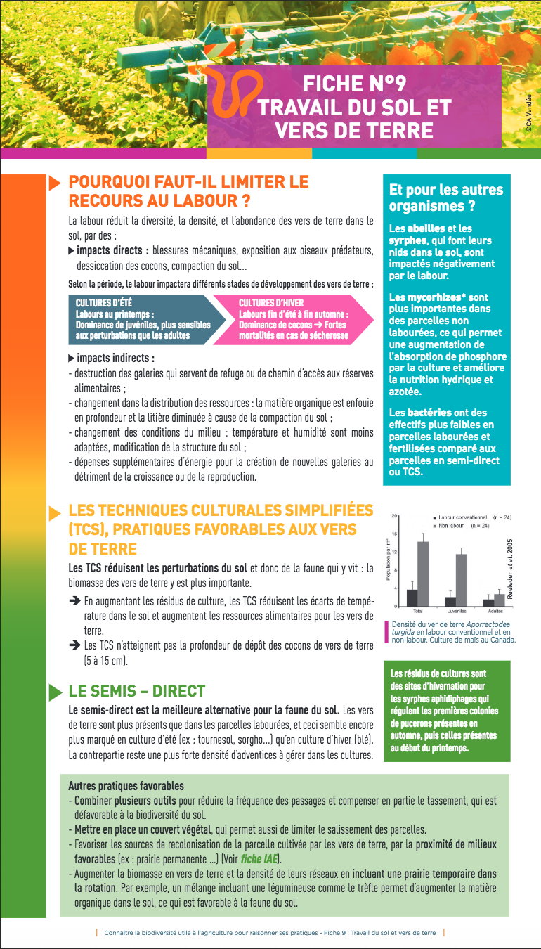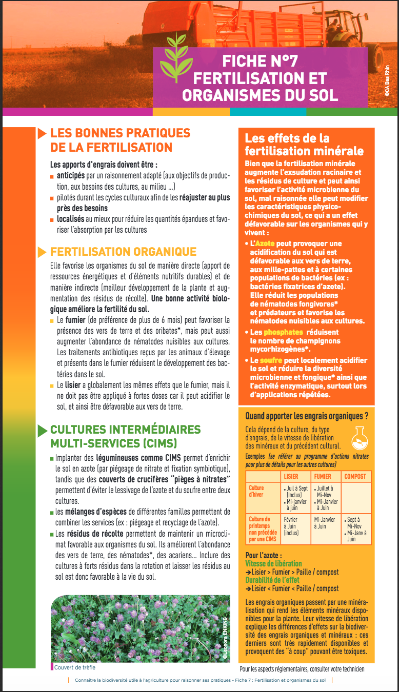 Issues d’un partenariat entre des équipes de recherche et des acteurs de terrain*, ces fiches présentent les principaux services apportés par la biodiversité à l’agriculture. Elles regroupent des données scientifiques récentes et contextualisées. Colorées et très illustrées, elles permettent en une rapide lecture d’en savoir plus sur les vers de terre, araignées, coléoptères, syrphes et flore des champs ! Pour aller plus loin et passer à l’action, des informations pratiques pour favoriser cette biodiversité utile donnent au lecteur des pistes de réflexion, à approfondir selon le contexte pédo-climatique et les choix techniques de l’exploitation agricole.