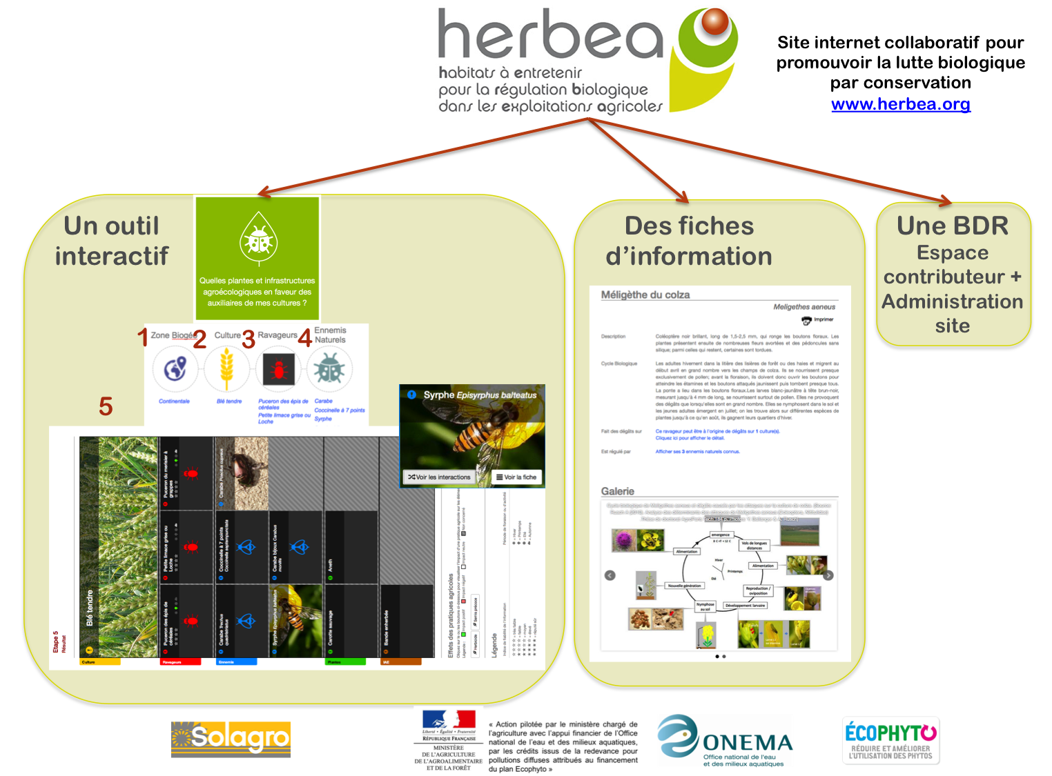Dans l'outil interactif, l'internaute choisit la zone biogéographique (étape 1), la culture (étape 2), les 3 ravageurs principaux (étape 3, un choix par défaut est possible), les 6 ennemis naturels de ces ravageurs (étape 4, un choix par défaut est possible) pour afficher les plantes non cultivées et les infrastructures agroécologiques les plus favorables à son système.