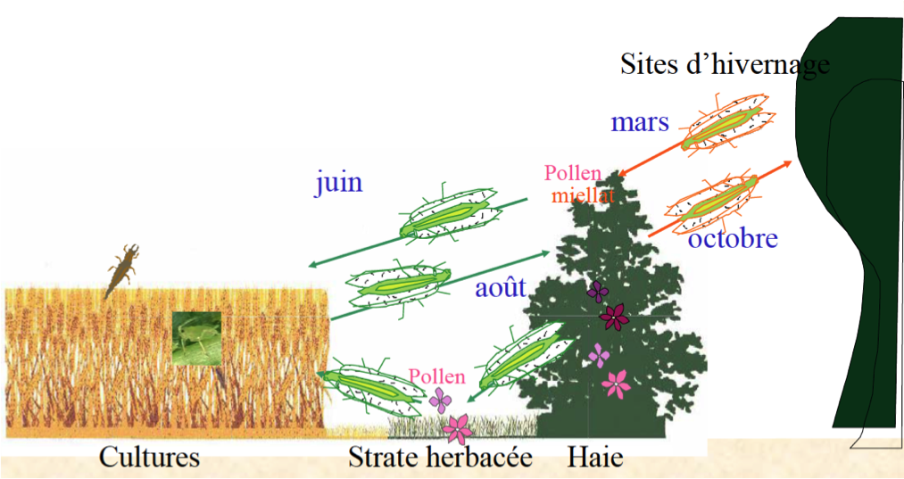 A au moins un stade de leur cycle de vie, 90% des espèces d'auxiliaires et et 50% des espèces de ravageurs ont besoin d'un environnement non cultivé en guise d'abris pour hiverner, estiver ou se reproduire et/ou comme source de nourriture complémentaire ou supplémentaire. 1 |