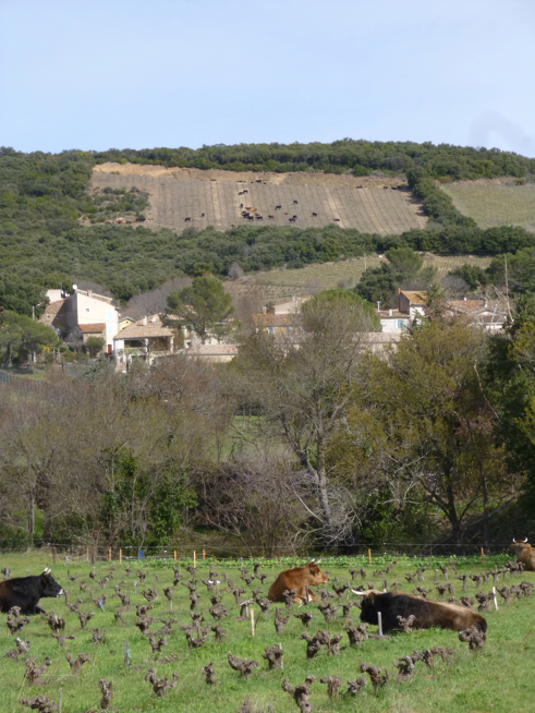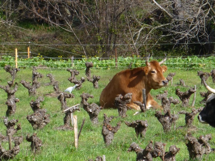 Parallèlement à cela, ils font pâturer (pour en savoir plus ► Agro-pastoralisme) leurs 60 vaches de races rustiques, 1 cheval, 1 âne, et 1 mule dans les vignes de fin novembre à début avril, quand les premiers bourgeons apparaissent. Les animaux vont permettre de maîtriser l’enherbement, et d’enrichir le sol en matière organique par leurs déjections. Et Didier peut constater les effets de cette fertilisation : les vers de terre sont nombreux, il a déjà pu en trouver 27 dans une seule bouse ! Ces derniers sont aussi appréciés des oiseaux, notamment des bergeronnettes, qui sont elles aussi nombreuses sur le vignoble.